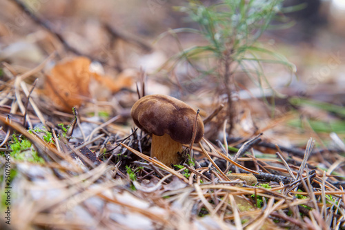 Wild edible bay bolete known as imleria badia or boletus badius mushroom growing in pine tree forest..