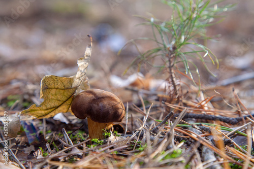Wild edible bay bolete known as imleria badia or boletus badius mushroom growing in pine tree forest..