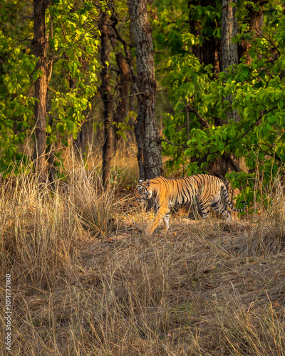 wild female bengal tiger or tigress or panthera tigris side profile walking or territory stroll in hot summer season safari at bandhavgarh national park forest reserve madhya pradesh india asia