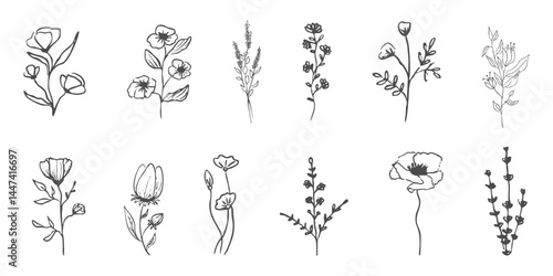 Wild forest herbs and flowers vintage textured chalk drawing sketch. Line grass retro flora silhouette. Crayon doodle hand drawn