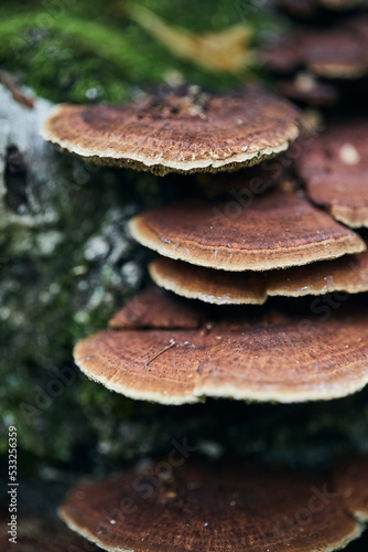 Wild inedible mushroom grows in the forest near Moscow on a tree with moss. Vertical photo.