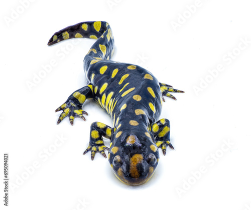 Wild male Eastern tiger salamander - Ambystoma tigrinum tigrinum - black and bright lemon yellow spots blotches. North central Florida version. Isolated on white background front top view