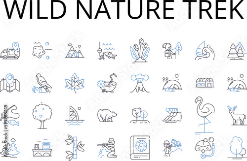 Wild nature trek line icons collection. Rugged mountain climb, Deep sea dive, Serene beach stroll, Majestic waterfall, Mysterious cave exploration, Scenic forest hike, Coastal bike ride vector and