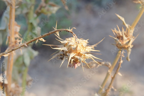 Wild plant. Thorn plant in garden in sunny day. Dry Carduus nutans grows in autumn. Seed head of wild flower.