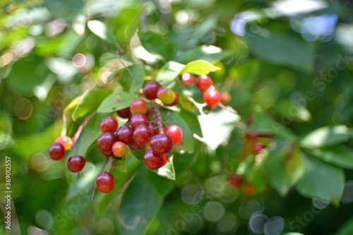 Wild red cherry, berry picking in the forest.