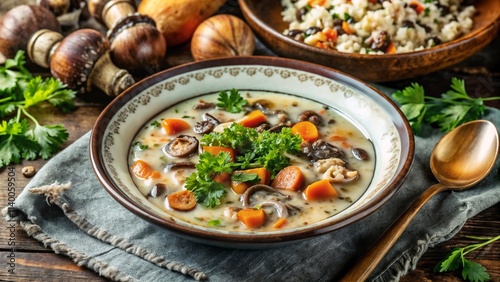 Wild rice soup with fresh parsley and mushrooms served in bowl on rustic table