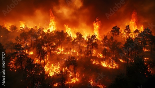 Wildfire engulfing a dense forest, the orange flames leaping into the air