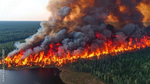 Wildfire engulfing a forest, creating smoke and flames near a body of water.