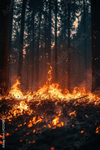 Wildfire in a dense forest, orange flames generating ash and dust particles, contributing to natural causes of PM pollution in the atmosphere.