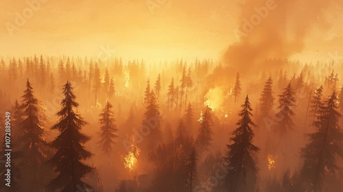 Wildfire spreading through dense pine forest under an intense orange sky