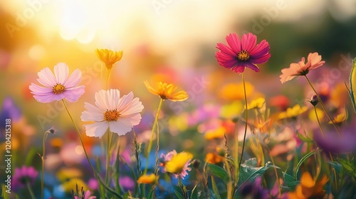 Wildflowers in bloom, close-up of delicate petals in bright sunlight, colorful field in the background