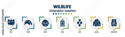 wildlife concept infographic design template. included nest, tapir, sloth, cage, hive, anthill, waistcoat icons and 7 option or steps.