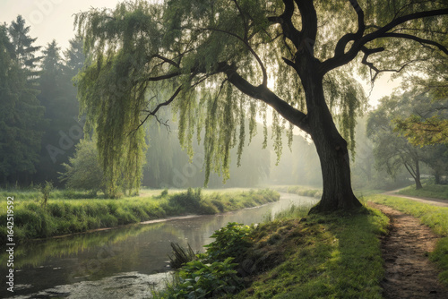 Willow Tree beside Small Forest Stream with Hanging Branches under Soft Daylight