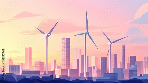 Wind energy for urban areas featuring sleek vertical wind turbines integrated into a cityscape