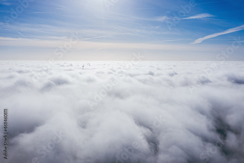 Wind farms sticking out above the clouds, aerial view of distant turbine propellers