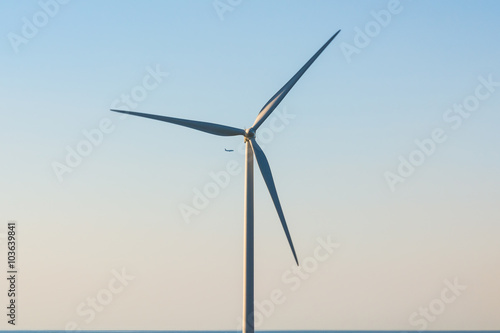 Wind generator in blue sky with a plane in the background