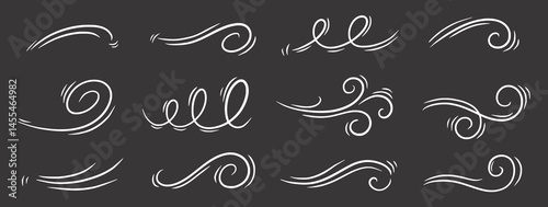 Wind line air swirl vector icon on chalkboard. Hand drawn doodle wind motion, air blow, swirl doodle elements. Sketch drawn air blow motion, smoke flow wave, abstract line. Vector illustration