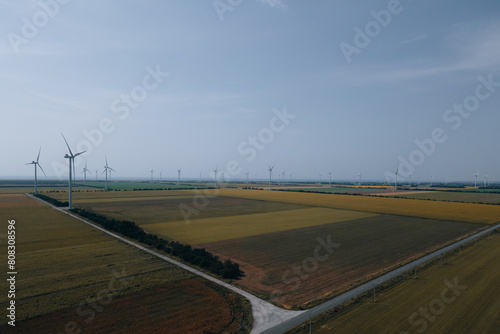 Wind power plant on a green field. Clean energy future. Photography from above. Energy in Ukraine.