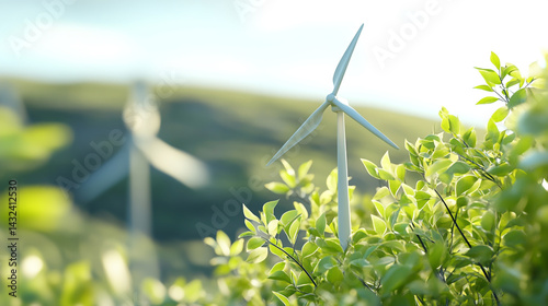 wind turbine and green leaves on a white background with a blurred landscape in the background.