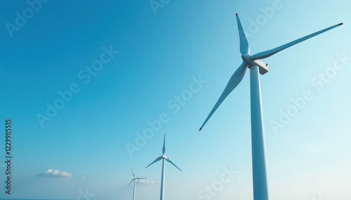 Wind turbine blades spinning against a blue sky, industrial, nature