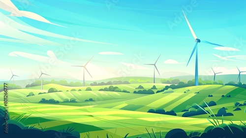 Wind Turbine Fields, Ideal for wind energy and eco-tech companies. Depicts rotating turbines in vast fields. Generative AI.