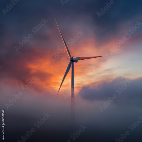 Wind Turbine Power Generation Sunset Clouds Background, Ideal for Green Energy Concept