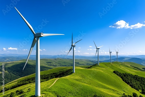 Wind turbines on a green hillside, spinning gracefully under a bright blue sky, representing the clean energy of wind power