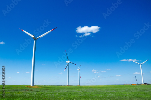 Wind turbines on green field blue sky clouds green energy concept renewable energy generator