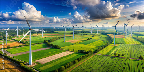 Wind turbines stand tall in vast green fields, converting wind into renewable energy under a clear blue sky with fluffy clouds. The rural landscape showcases sustainable technology