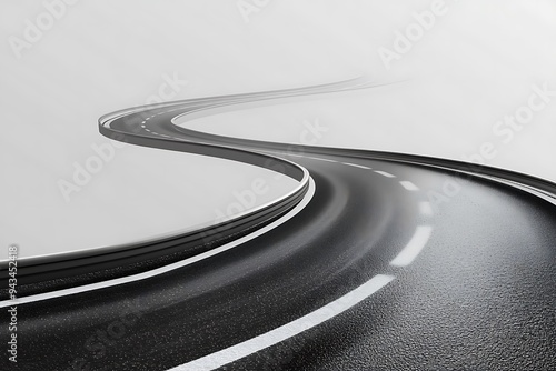 Winding asphalt road stretches through rural landscape, vanishing into the horizon under the vast sky