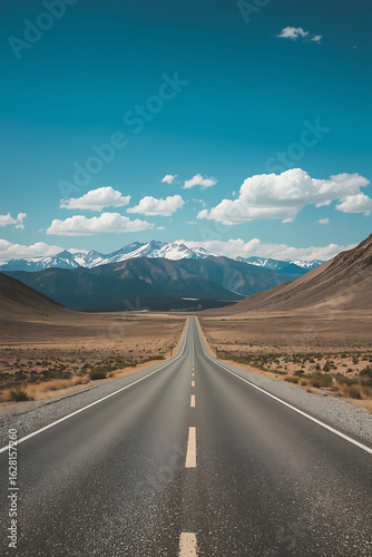Winding asphalt road traverses a dry, rocky mountain landscape, surrounded by snow-capped peaks, in a daytime scene with minimal vegetation and scattered clouds.