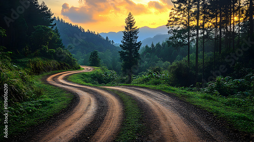 Winding Dirt Road Through Lush Green Forest at Sunset
