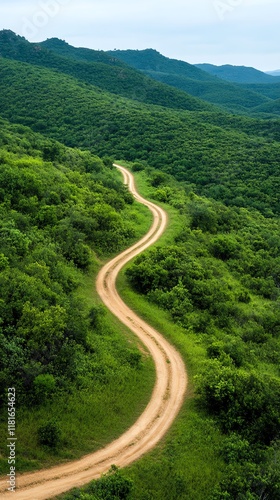 Winding dirt road through lush green hills.
