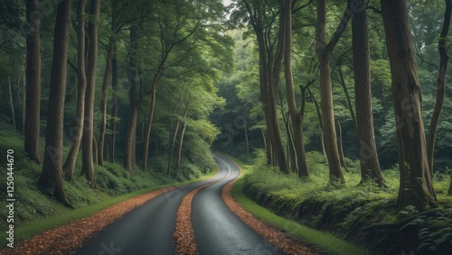 Winding Forest Pathway Surrounded By Lush Green Trees And Fallen Leaves Inviting Nature Walks And Scenic Drives Through Serene Landscapes