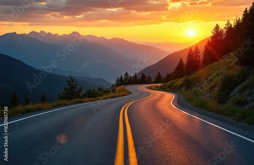 Winding mountain road at sunrise, golden sunlight illuminating asphalt curves, distant peaks. Vibrant sky with orange, yellow gradient hues creates peaceful, majestic natural landscape perfect for