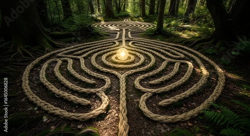 Winding path of a sacred labyrinth in a deep forest, a spiritual journey to a glowing sphere of enlightenment