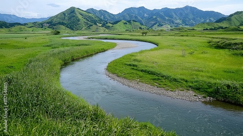 Winding River Flowing Through Lush Green Mountains and Open Fields