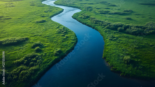 Winding river flows through lush green fields at golden hour in a serene landscape