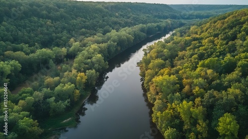 Winding river flows through lush jungle landscape at golden hour, capturing nature's beauty