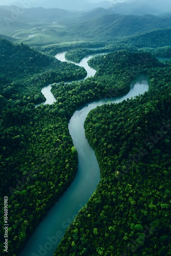 Winding river through lush green forest.