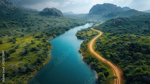 Winding Road and River Through a Lush Green Valley with Rocky Hills in the Background