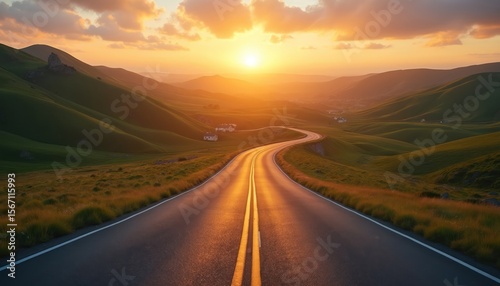 Winding road leads towards bright horizon. Symbol of journey through challenges. Inspirational business, motivation, success concepts. Pathway to goals, achievement. Adventure, progress, exploration,