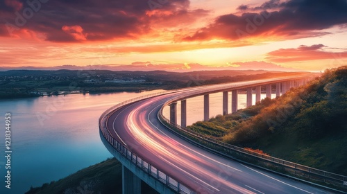 Winding Road Over Water at Sunset with Scenic View and Vibrant Sky