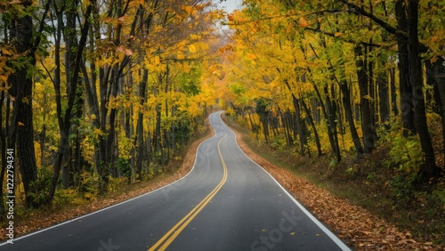 Winding rural road surrounded by vibrant autumn foliage featuring shades of yellow and orange, capturing the essence of a serene fall drive.