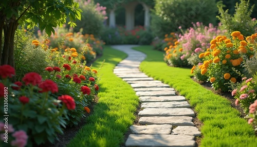 Winding stone path meanders through vibrant rich garden. Bright colors of flowers, lush green grass create serene atmosphere. Sunny summer day. Perfect for walking enjoying nature, outdoor recreation.
