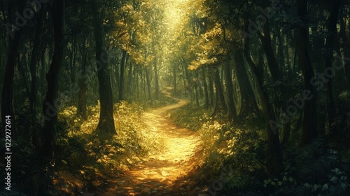 winding trail through a dense forest, where the trees are so close together that the sunlight only barely touches the forest floor.