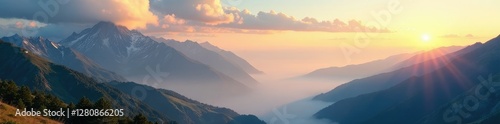 Winding wisps of cloud drift across sunlit mountainsides, scenery, serene