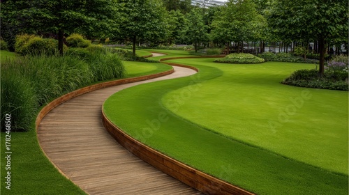 Winding wooden garden path creating a tranquil journey through carefully manicured green lawns and lush landscaping, offering a peaceful natural escape