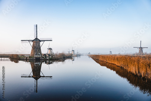 Windmills in the Netherlands during blue hour after sunset