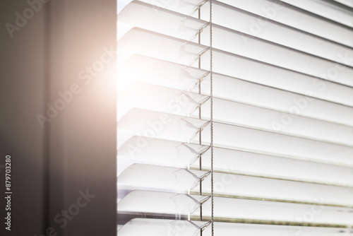 Window blinds texture. Closeup jalousie pattern. Parallel lines background. Diagonal line. Sunlight protection. Home interior window. Sunlight window background.